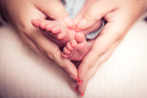 Eine Mutter hält ihr Baby liebevoll im Arm, beide tragen helle Kleidung vor neutralem Hintergrund