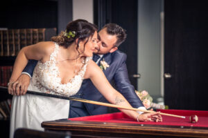 Hochzeitspaar küsst sich zärtlich unter einem alten Backsteingewölbe mit Brautstrauß in der Hand