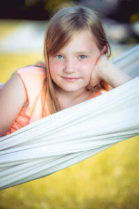 Ein blondes Mädchen im blauen Kleid mit Blümchenmuster liegt auf der Wiese, stützt den Kopf in die Hände und schaut verträumt in die Kamera. Weiches Licht und warmer Hintergrund sorgen für eine idyllische Stimmung.